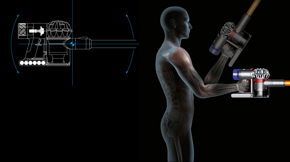 Using Archimedes' principle of the lever, Dyson engineers positioned key components like the motor and battery above and below the head. This shifts the centre of gravity, making the machine lighter and easier to use.